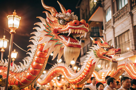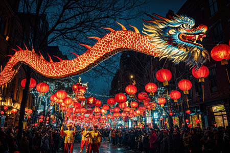 Chinese new year celebration with dragon parade in chinatown festive street scene nighttime cultural experience