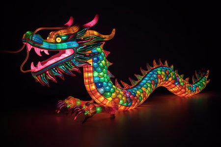 Chinese dragon lantern with bright glowing head isolated on the black background. Copy space on the left side.