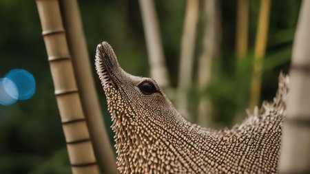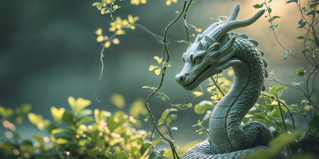 AI Generated. Intricate Stone Sculpture of a Mythical Creature Among Lush Greenery