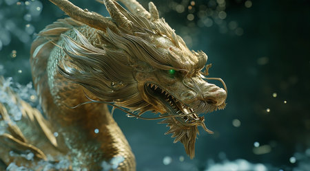 Beautiful chinese Dragon in front of dark with gold chinese dragon and light gold emerald color