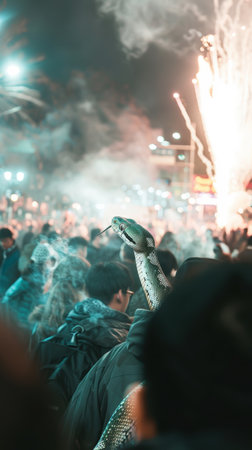 A snake in a crowded street during vibrant Chinese New Year holiday celebration, with fireworks illuminating the night sky