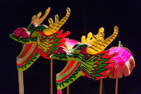A close-up of a Chinese dragon dance prop with vibrant colors. No people, copy space.