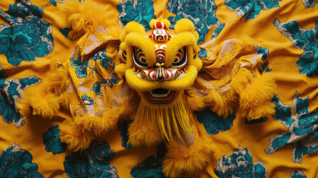 A striking yellow lion dance costume rests on a floral background, showcasing intricate design and cultural heritage. Perfect for festive celebrations.