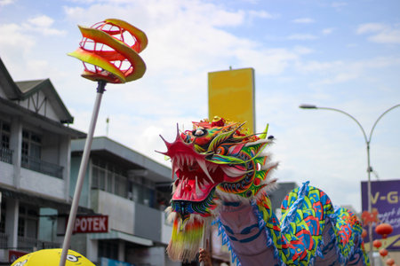 A vibrant dragon with intricate patterns and vivid colors is performed during a dragon dance at the Cap Go Meh festival in Pontianak City, celebrating Chinese New Year.