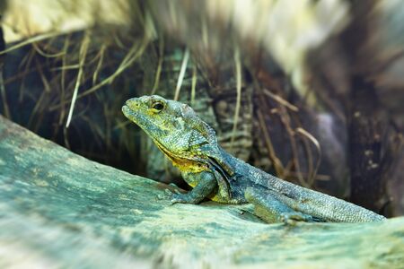 Side profile view on lizard peeking head up on rock outdoors with obscured background and foreground