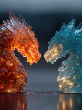 Two mesmerizing dragon sculptures in striking orange and blue hues, expertly crafted from crystal and glowing, symbolize the dual forces of fire and ice.