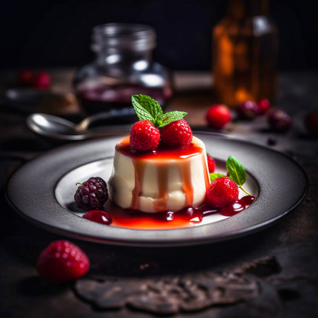Decadent panna cotta with fresh berry compote, smooth and creamy texture, elegant dessert, soft lighting