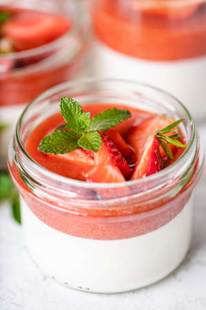 Panna cotta in glass jar with strawberry sauce and mint leaf.