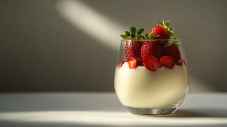Panna cotta in a glass with fresh strawberries on top, captured in a minimalist style with hard lighting and deep shadows for an artistic touch.