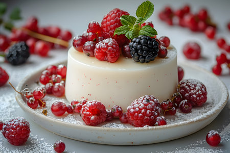 A delightful dessert featuring creamy panna cotta topped with fresh berries and a sprig of mint. Perfect for gourmet presentations and sweet indulgence.