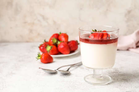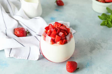 Tasty strawberry panna cotta on light background