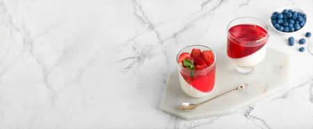 Italian dessert. Raspberry Panna cotta with raspberry jelly on a light background. Berry dessert with cream sauce in small jars. Long banner format. place for text.
