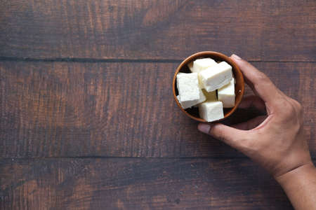 man hand holding a bowl of cheese on table