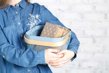 Close-up details of the basket, soft selective selective focus. Twisted bars woven with each other, basket, bow.