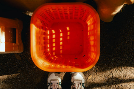Top view of plastic orange shopping basket and feet of a buyer at local urban market. Organic produce on sale at outdoor farmer market. Close up. Part of the series.