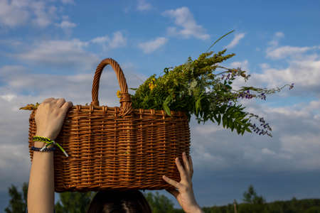 A wicker basket with wild flowers stands on the girl's head, she holds the basket with her hands.Against the background of the morning blue sky with clouds