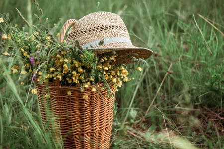 A bouquet of yellow-blue wildflowers in a wicker basket and a summer straw hat in the field. copy space. selective focus.