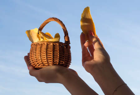 dried mango in a wicker basket in the hands of a girl against the sky.