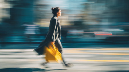 A dynamic depiction of a woman in stylish attire walking briskly across a busy street, clutching a yellow bag, encapsulating urban energy and motion.