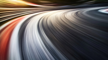 Motion-blurred S-curve section of a race track, shot from low angle with speed lines emphasizing forward momentum and tension