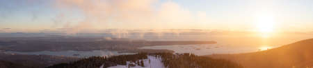 Beautiful Panoramic Canadian Landscape view from top of Mt. Gardener Hike with Howe Sound in Background during Vibrant Sunset. Located in Bowen Island, near Vancouver, British Columbia, Canada.