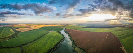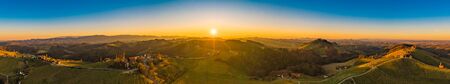 Beautiful panoramic aerial view over a countryside sunrise with fields and trees in southern germany