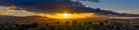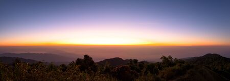 Mountain range and beautiful sunset scene view. Sky clouds with sunlight in the evening. Horizon sky landscape and dusk sky background