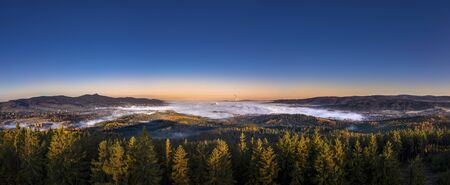 Sunrise over Liberec, view from viewpoint Cisarsky kamen, Jested mountain, Czech Republic.