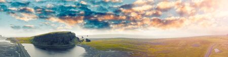 Reynisfjara Beach and mountain landscape at summer sunset, Iceland.