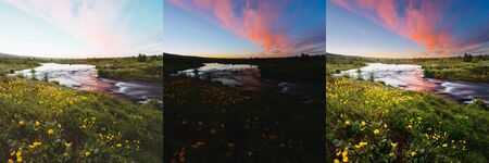 Three photos with different exposures of combined to HDR. Location place Geyser Park, Iceland, Europe. Images before and after. Original or retouch, example of photo editing process. Beauty of earth.