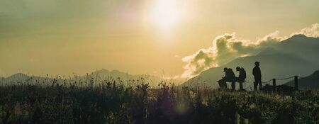 Silhouette of people at gold sunset and mountains background