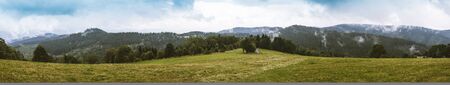 Small cottage in the Carpathian mountains in the morning fog-panoramic view, Transylvania, Romania