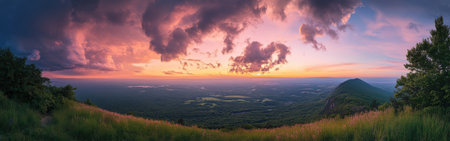 Majestic sunrise over green hills.