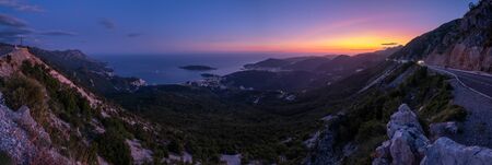 Summer Budva riviera night coastline panorama landscape.