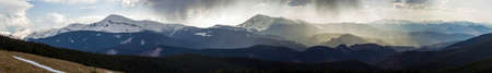 Breathtaking panoramic view of magnificent foggy Carpathian mountains, covered with ever-green forest on misty quiet morning or evening under dark cloudy sky. Mountains snow covered tops in distance.