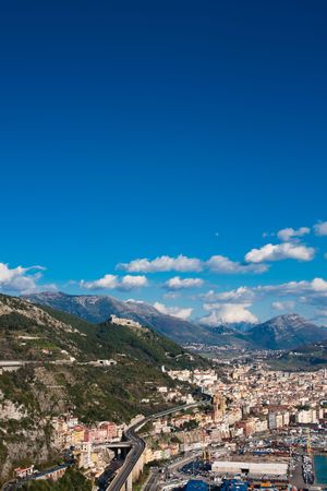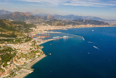 Aerial view to Vietri sul Mare and Salerno city and mountains, Italy. Beatuful view from above to the sea and landscape. Big and small ships near town and city.