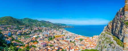 Panorama view on cityscape of Cefalu from drone. Tyrrhenian Sea. Sicily, Italy