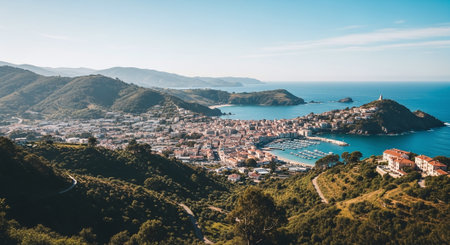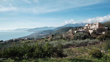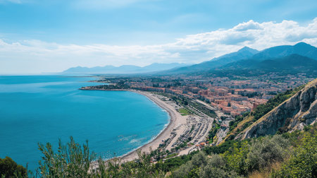 Scenic view of a picturesque coastal town on the Mediterranean Riviera from the vibrant blue sea on a sunny day
