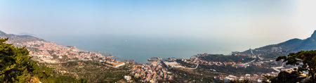 Beautiful wide panoramic view to beaches in Menton, France. Tourism concept