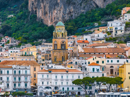 Amalfi Cathedral Bell Tower with Pastel Buildings and Cliffs