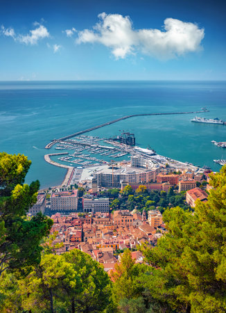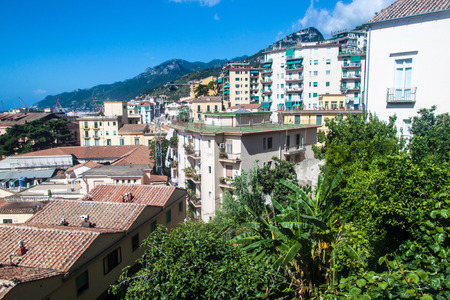 Aerial summer cityscape of Salerno town. Green outdoor scene of Italy, Europe. Splendid Mediterranean seascape. Travel concept background.