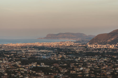 Residential Homes and Historic Buildings with mountains in background in Palermo, Sicily, Italy. Sunset Colorful Sky. Panorama