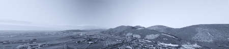 Morning winter calm mountain panorama with sheds group and mount ridge behind (Carpathian Mountains, Ukraine). Nine shots stitch image.