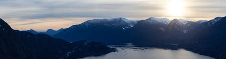 Aerial Panoramic View of Canadian Mountain Landscape during a colorful sunset. Taken in Garibaldi, near Whistler and Squamish, North of Vancouver, British Columbia, Canada. Nature Background Panorama