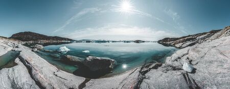 Aerial panoramic 360 degrees view of Jokullsarlon Glacier Lake and Icebergs at sunset, Iceland.