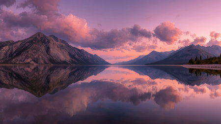 A breathtaking landscape featuring a serene lake perfectly mirroring the vibrant purple and pink hues of a sunset sky, with dramatic clouds and towering mountains framing the scene, creating a peaceful and picturesque view.
