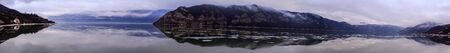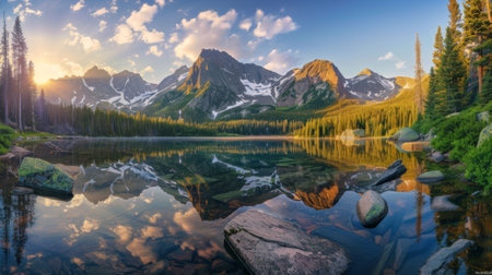 A stunning panoramic view of a serene mountain lake, featuring a pristine reflection of majestic peaks and lush forests under a clear blue sky. This image evokes tranquility, natural beauty, and the grandeur of untouched wilderness