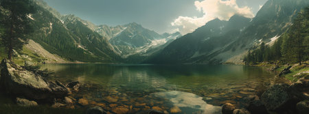 A panoramic view of the Tatra Mountains with green mountains, clear lake water, and golden rocks. The sun shines on part of it, creating beautiful reflections in Morskie Oko Lake near Zakopane. Snow-capped peaks rise above the forested hillsides, adding to its majestic beauty. A warm glow bathes everything from left to right, highlighting details like rocky textures or tree foliage. This picturesque scene captures the serene essence of mountain landscapes. --ar 27:10 --v 6.1 Job ID: cbf5ce46-fcee-4506-9f85-b6b58a3d71dc