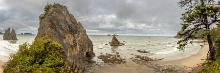 Panorama of Rialto Beach from cliff above coast