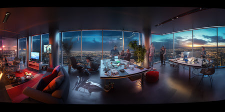 Generative AI : Aerial 360 degree spherical panorama photo taken at night above the Leeds City Centre in West Yorkshire UK